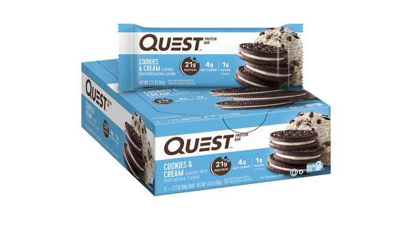 Bite into real cookie crumbles and delicious cream with absolutely no guilt. The Cookies and Cream Quest Protein Bar has 21 grams of protein, tons of fiber and no sugar added. With 5g Non-Fiber Carbs. 20g High Quality Protein, Gluten Free, No Sugar or Sugar Alcohols Used. The only protein bar with a perfect nutritional profile. Quest is the first bar you can eat guilt free. Quest is the first truly low car bar that doesn't contain glycerin or simple carbs.